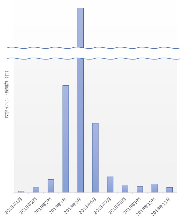 下記のグラフは、2018年11月時点のe-Gateセンターの監視システムにおいて、当脆弱性を狙った攻撃イベント検知数の推移を示しています。