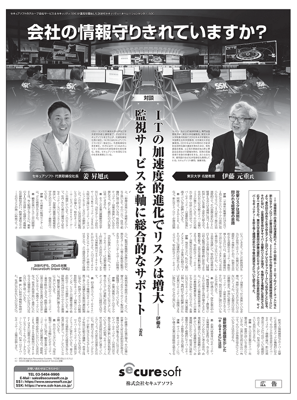 SSK(サービス&セキュリティ株式会社)が40年以上に渡って築き上げてきたIT運用のノウハウと、最新のメソッド、次世代SOC"e-Gateセンター"この2つを融合させることによりお客様の情報セキュリティ全体をトータルにサポートするのがSSKの"e-Gate"です。e-Gateセンターを核として人材・運用監視・対策支援という3つのサービスを軸に全方位のセキュリティサービスを展開しています。