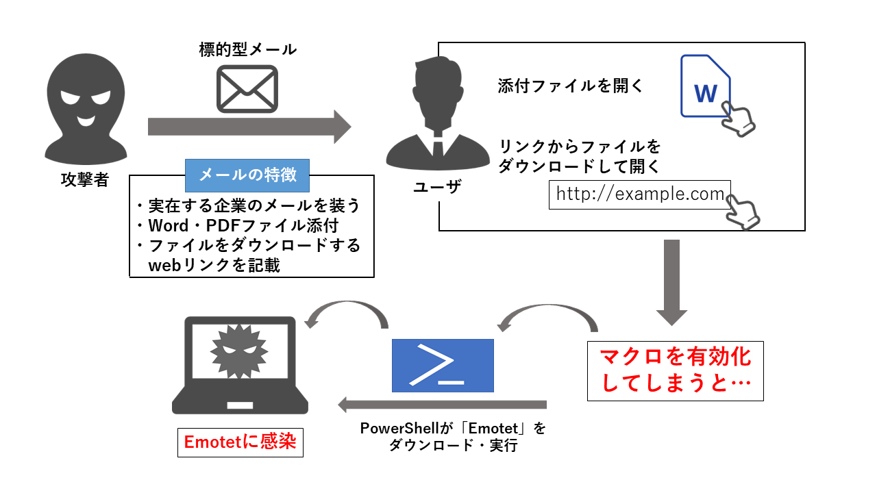 Emotet の感染拡大を狙う攻撃者は特定の相手に狙いを絞った「標的型攻撃」を仕掛けます。標的型メールは過去メ ールの返信を模したメールを送信する等、巧妙化しており Emotet に限らず標的型メールに対しては注意が必要です。 Emotet の感染パターンとしては下図 1 のような標的型メールに添付されたファイルから感染します。