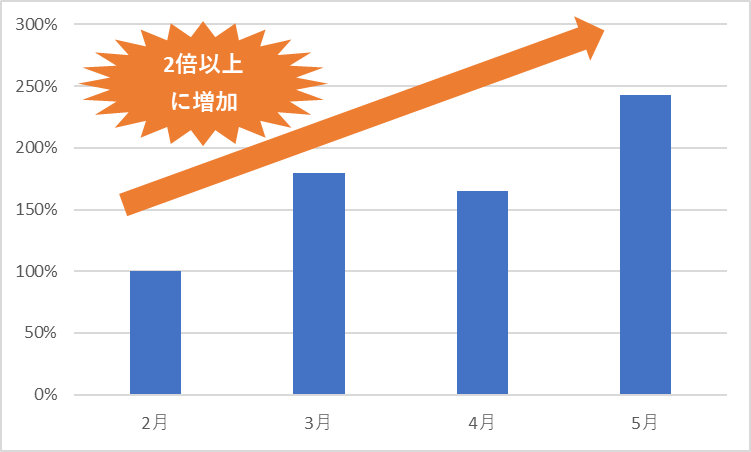 e-Gate センターでは WordPress を狙った攻撃通信が継続的に検知されています。以下は今年 2 月から今年 5 月までの4か月間の件数を表すグラフです。2 月と比べると 5 月の検知件数が 2 倍以上に増加しています。